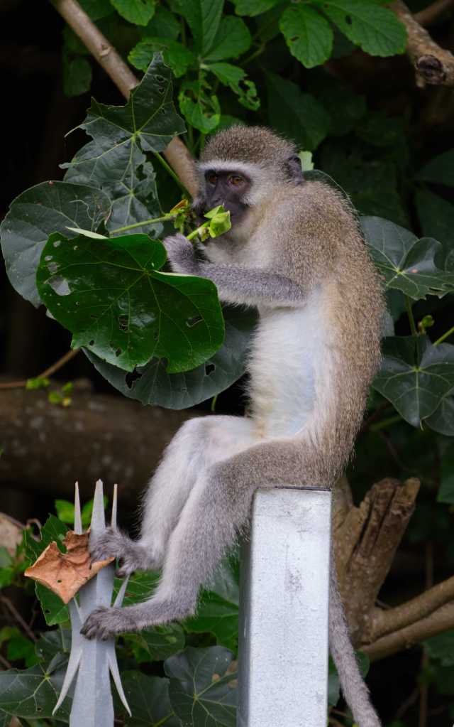 This boldness often doesn’t go over well. Farmers may label them pests, and in some places, they are trapped, relocated, or worse. But the vervets persist. In towns and villages, they navigate human spaces with uncanny precision scaling fences and bypassing locked gates with practiced ease. They raid with surgical precision—one monkey acting as lookout, another opening the gate latch, a third opens a cupboard or pops off a Tupperware lid looking for the prize within. Their cleverness is their greatest survival tool—and the very thing that so often causes them to be misunderstood.