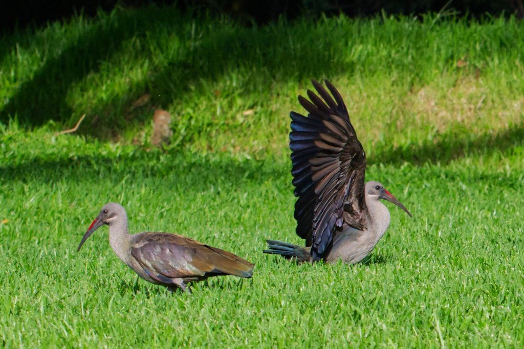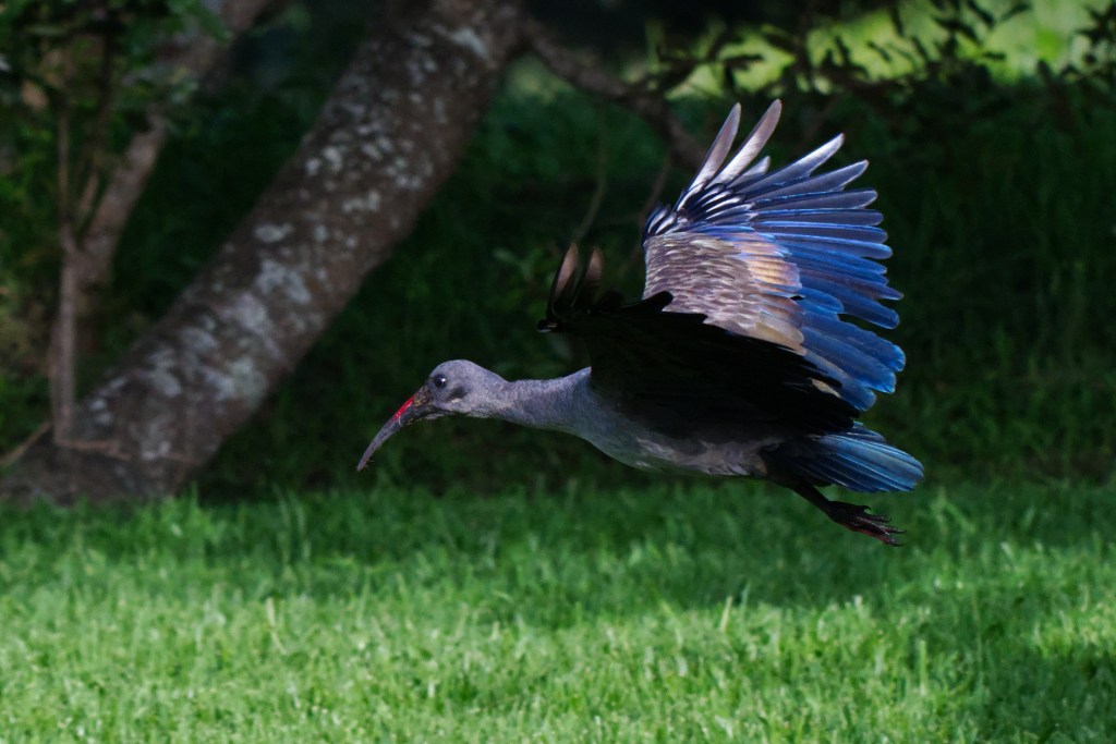 Yet the Ibis is also at home on the edges of our everyday lives, not bound only to wild ponds and reedbeds. In city parks and along the greens of golf courses, they wander the grass with the casual air of locals who’ve been here forever. There, their curved bills probe the soil for grubs and insects, each movement as deliberate as in the wetlands. These birds are usually the Hadeda Ibises, known for their loud, unmistakable call—a rolling “ha-ha-ha-de-dah” that echoes through the morning air. For many, it’s the familiar sound that marks the start of the day. The Hadeda’s plumage, from a distance, seems plain grey, but catch them in the right light and the wings reveal a subtle iridescence — hints of bronze, green, and violet.
