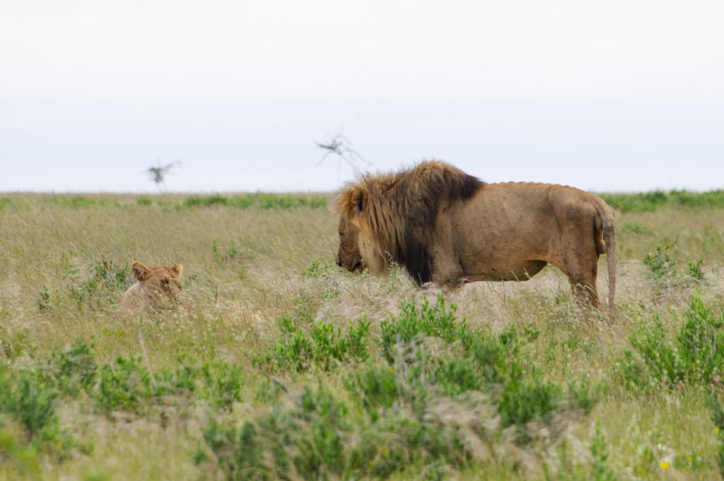 In the rains of Etosha, the male and female lion are cast in quiet contrast. The male rises above the grass, mane lifted by the damp breeze, his watchful presence marking the horizon. At his side, the female rests in the green, her body half-hidden in the tall blades, her eyes following what he does not. Together they are balance — his stature, her silence — each completing the other in the rhythm of the savanna.