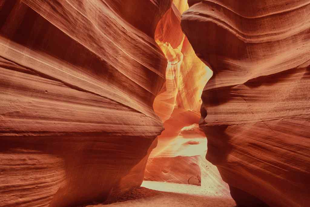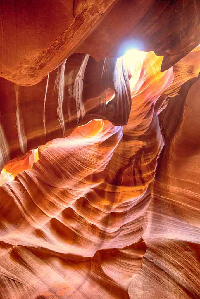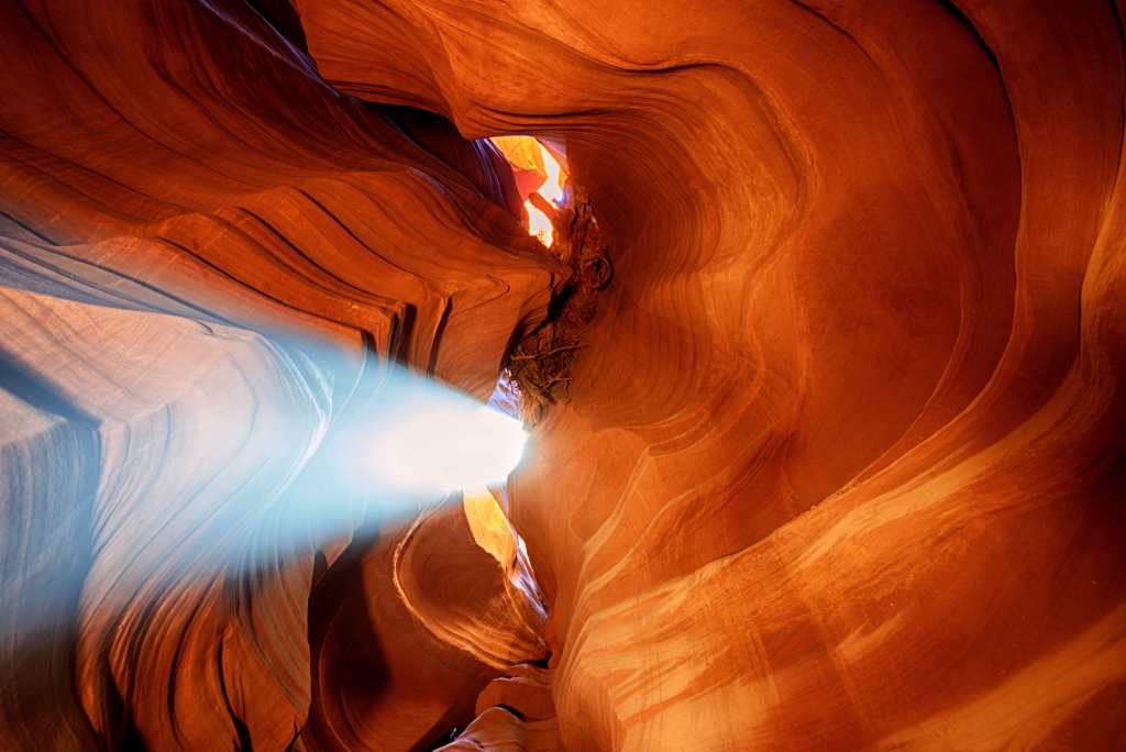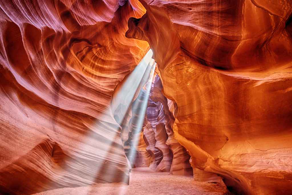The most celebrated feature of Upper Antelope Canyon is its light beams. Around midday, especially in summer, shafts of sunlight angle through the cracks above and form columns of light that reach to the canyon floor. Dust or sand stirred into the air makes these beams visible, glowing as though the canyon were illuminated from within.