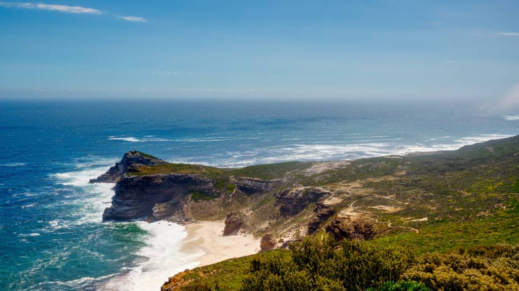 The road that winds toward Cape Point traces past some of the Cape Peninsula’s most breathtaking beaches. Vast white sands stretch for kilometers, their brightness almost blinding under the African sun. These are not secret bays tucked under cliffs, but great sweeps of shoreline open to sky and sea, where the horizon feels impossibly far away.