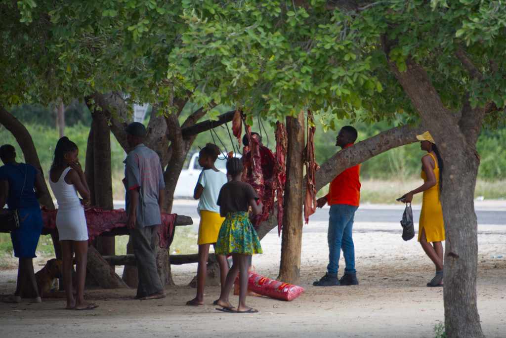 Along the roadside, small markets gather in the shade of great trees where the branches themselves become part of the stalls. Tables are laid out beneath them, covered with neatly stacked produce — oranges, tomatoes, melons — while from the branches meat is hung ready to become the evening meal. People gather in clusters, laughing and talking, their clothing vivid against the soft tones of the earth — reds, yellows, blues catching the light as they move from table to table.