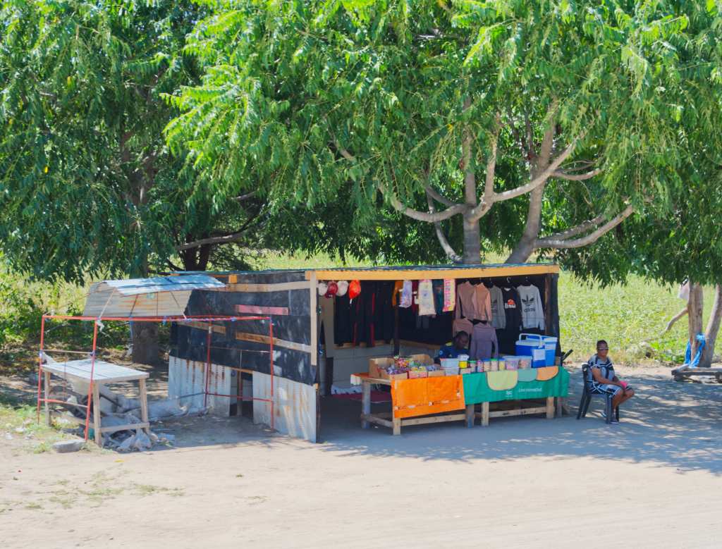 Further down the road stands a small lean-to, its roof of tin sheets held down with stones, the walls little more than poles and bits of fabric tied against the wind. Inside, a wooden table holds neat rows of sweets in plastic bins, packets of biscuits, and small piles of folded clothing — bright shirts, scarves, and hats that catch the light as the breeze moves through. A hand-painted sign leans against one post, faded but cheerful, and behind the counter, the shopkeeper sits quietly, greeting travelers with an easy smile. The place feels temporary, yet enduring — a small pause of color and life against the long stretch of road. The scene feels both timeless and full of motion, a reflection of how the old ways of trade have simply adapted to the new roads that now run through this land.