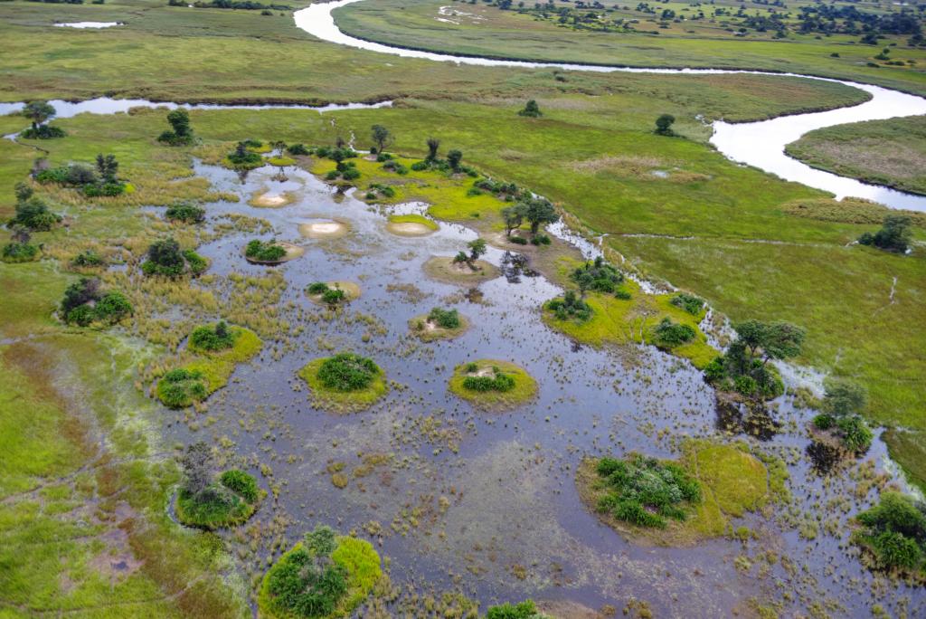 There is only one true way to understand the Okavango Delta: from the air. To see its shape, its scale, its endless unfolding, you must rise above it — into the wide heat and the weightless light. Most travelers come here by open helicopter, doors unlatched, wind pouring in as the land unrolls beneath them. From that vantage, you can see how the Delta breathes. The patterns that make no sense from the ground — the looping waterways, the fan-shaped spreads of green — resolve themselves into meaning. You can trace the slow veins of floodwater as they divide and rejoin, see herds moving like dark currents through the grass, and watch the sunlight scatter across a million mirrored pools. From above, the Okavango reveals itself for what it truly is: a living mosaic, as fluid and restless as the sky itself.