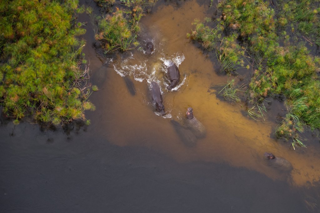 From above, the Delta’s pools and channels are alive with motion that seems, at first, to belong to the water itself. Then, with a subtle shift of shadow, you see them — the rounded backs of hippopotamuses, surfacing in slow sequence, the air trembling with their breath. They gather in families, thick-skinned and ancient, their forms rising and sinking in rhythm with the light. Some rest shoulder to shoulder in the deeper lagoons, eyes and nostrils just breaking the surface, while others drift toward the reed beds where they feed at night.