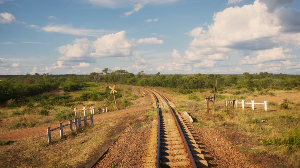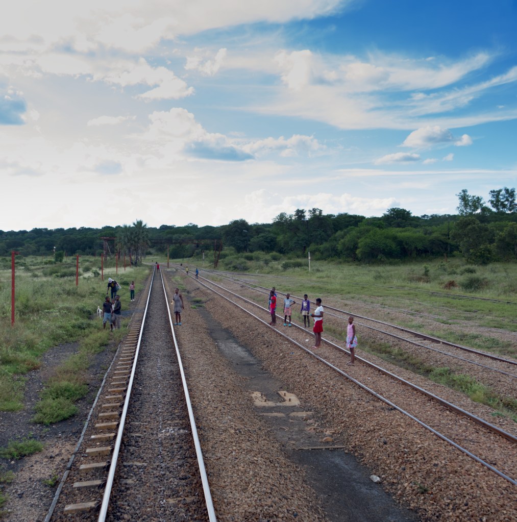 The Zimbabwe countryside unfolds slowly, punctuated by signs of daily life. Small villages cluster near dirt roads, and occasional homesteads appear as muted shapes among the grasses. Children pause their games to watch the train pass, their figures silhouetted against the fading afternoon sun. Farmers tend small fields, hoes in hand, turning the soil or gathering crops, while water jugs rest nearby. Each glimpse offers a quiet insight into life lived along the line, fleeting but distinct, stitched together by the rhythm of the rails.
