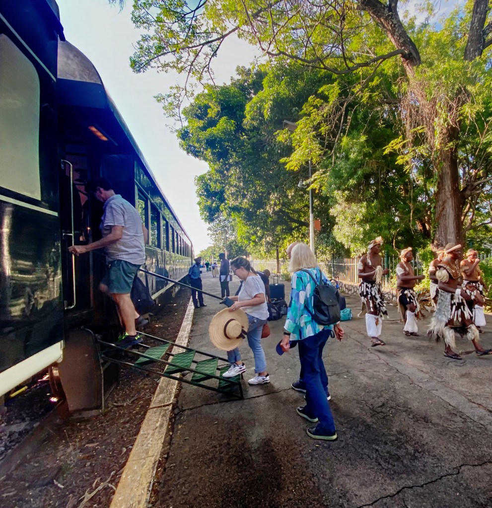 On the platform, the mood shifts from stillness to anticipation. Tickets are checked and returned with practiced efficiency, luggage lifted and guided toward open doors. A small group of Zulu dancers gathers near the edge of the station, their movements light and rhythmic, a brief burst of color and percussion against the muted morning. Drums echo off the concrete, hands clap, feet strike in time, and the platform becomes momentarily celebratory. When boarding resumes, the excitement lingers, carried up the metal steps and into the carriage as the train prepares to pull away.