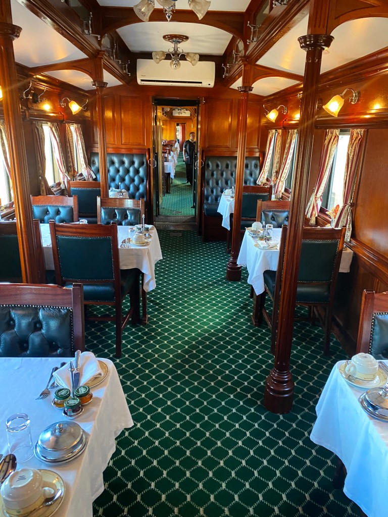 Inside, the Blue Train establishes its atmosphere. Corridors are hushed. Carpets soften footsteps. The low rhythm of wheels on rail forms a steady undercurrent, a sound that gradually recedes into the background of awareness. Windows frame the land generously, inviting observation rather than distraction.