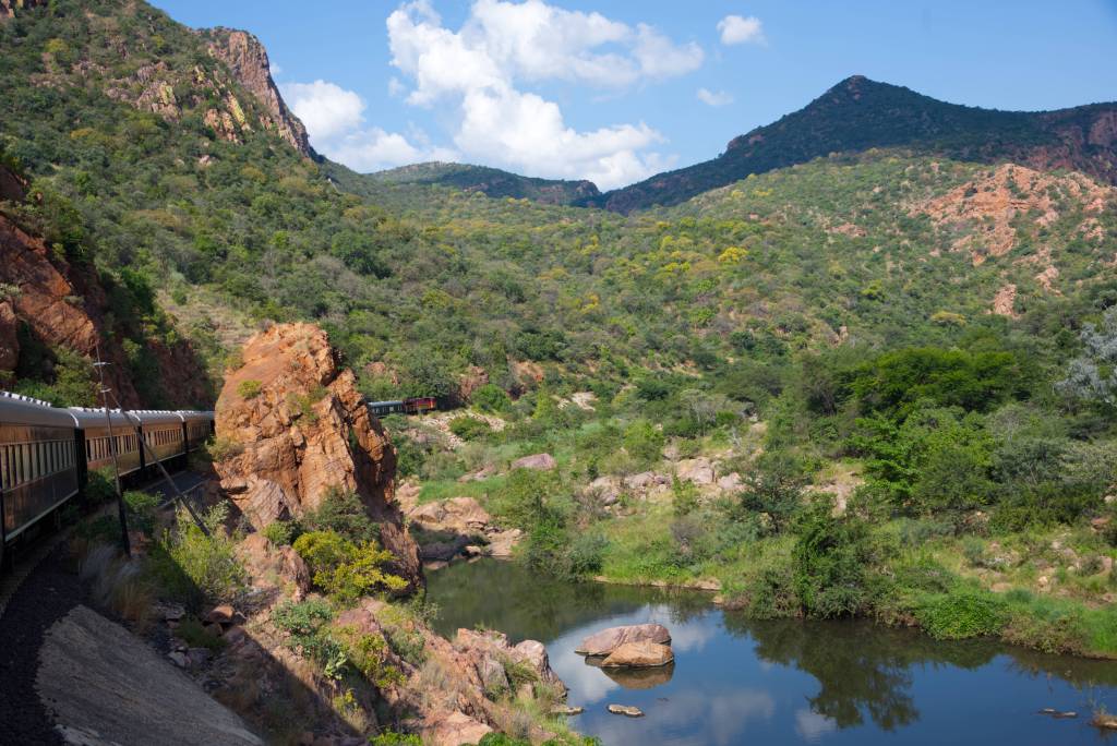 Beyond the border, the train enters a more mountainous stretch of South Africa, where the land rises with quiet authority. Hills stack into ridgelines, their slopes folding into one another, carved by time and shadow. Rock faces appear close to the tracks, weathered and dark, then fall away into shallow valleys threaded with scrub and hardy trees. The vegetation grows denser in places, clinging to the contours of the land, while distant peaks hold the last light along their edges. The journey feels newly vertical here, the train climbing and curving through terrain that slows the eye and deepens the sense of distance traveled.