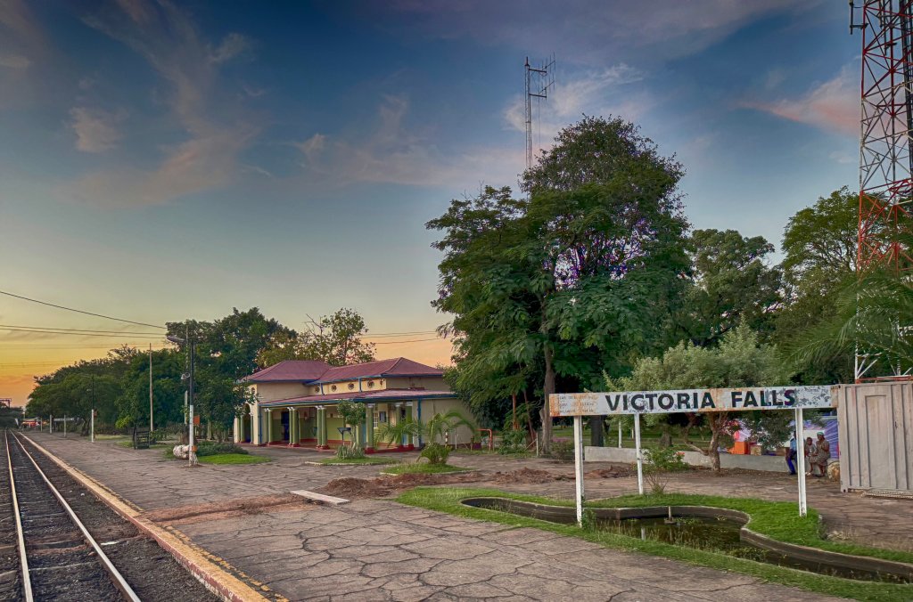 The train eases forward along a gentle curve, steel wheels whispering against the rails. Trees and brush slide past on either side, a muted blur of green and ochre, their edges softened by the warm, amber glow of late afternoon. Dust rises faintly where the tracks meet dry earth, stirred by the movement but quickly settling again. The platform recedes, then vanishes, leaving only the quiet rhythm of motion and the slow reveal of the land beyond Victoria Falls, intimate and immediate, yet expansive in its calm persistence.