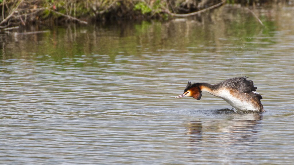 The great crested grebe belongs to water in a way that feels absolute. At Lackford Lakes it reads like a dark calligraphy stroke drawn across the surface, neck upright, body low, drifting between reed shadows and open brightness. Its legs sit far back on the body, turning every movement into a kind of underwater propulsion. On land it is seldom seen, and when it is, the impression is of something borrowed from another world, briefly set down on grass before returning to its element.