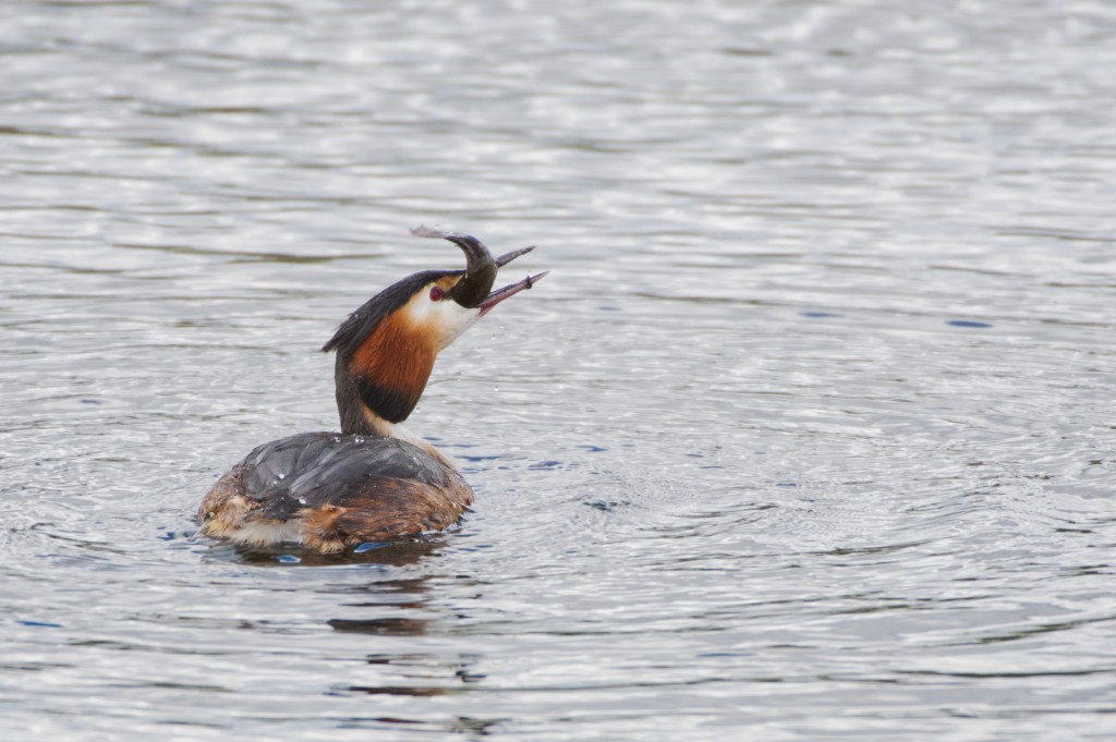 The grebe hunts by disappearance. It lowers its head, then vanishes beneath the surface without warning. The water closes behind it and offers no trace of direction. This behaviour repeats across open water and reed edges. The bird reappears elsewhere, sometimes close, sometimes distant, as if the lake has redistributed it.