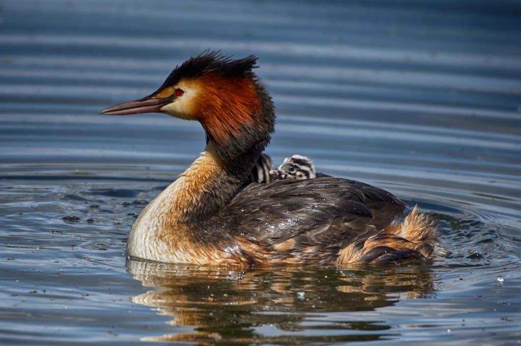 This is not a static refuge. As the adult dives, the surface breaks and reforms. Chicks may briefly enter water before returning to the back again, adjusting each time to the lake’s interruption of certainty. The effect is a layered presence. One body moving through water while carrying another life just above it.