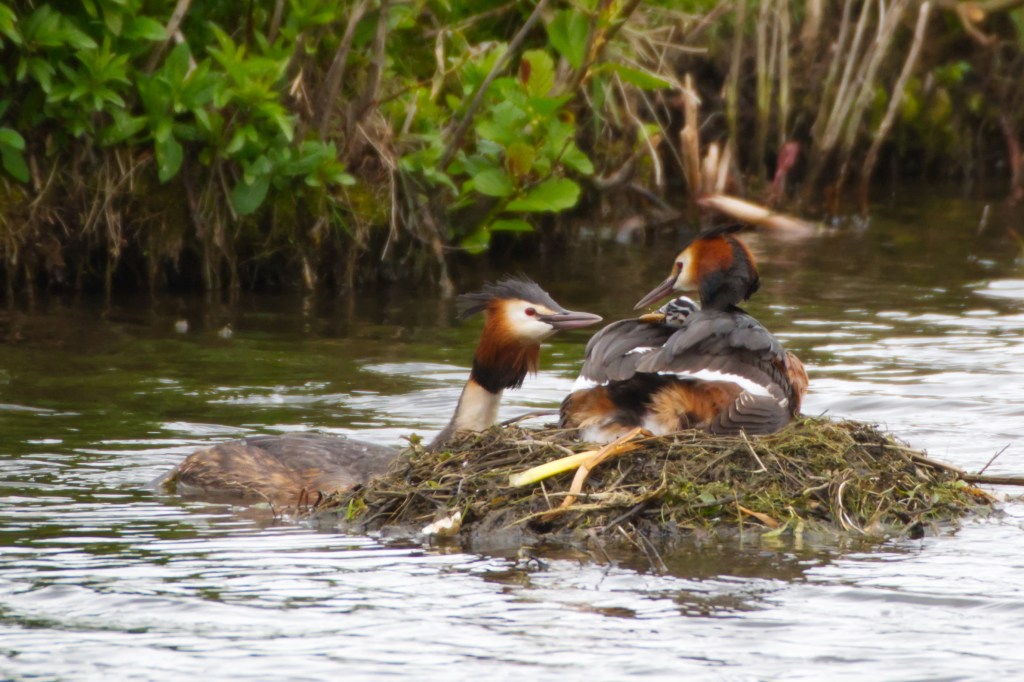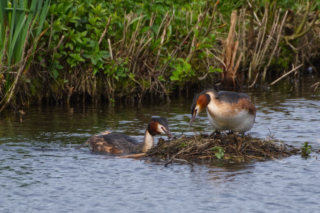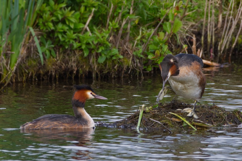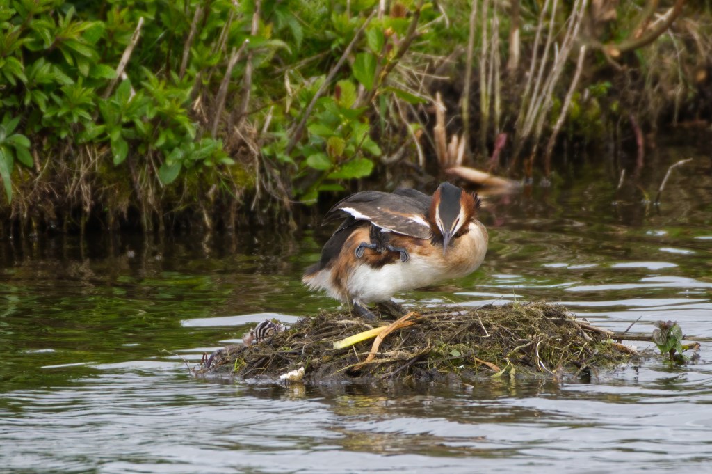 Once paired, grebes waste little time establishing a nest. Unlike many birds that retreat to trees or hedgerows, the great crested grebe builds directly on the water. The nest is a floating platform of decaying vegetation, anchored to reeds or submerged branches. This design is both practical and precarious. It rises and falls with the water level, adjusting naturally to changes in the lake. But it also means that the eggs are never entirely safe from disturbance, whether from waves, predators, or curious passersby.