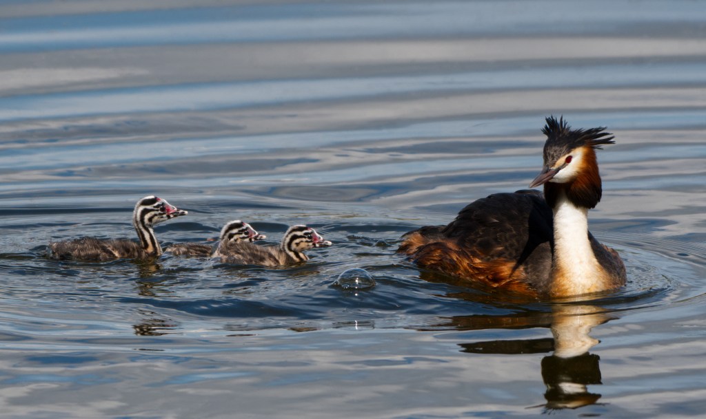 Yet independence is not immediate. Chicks remain tightly associated with adults, moving in close formation that reduces exposure and increases survival. What emerges is not a dispersal of young but a compact unit of movement within the lake.